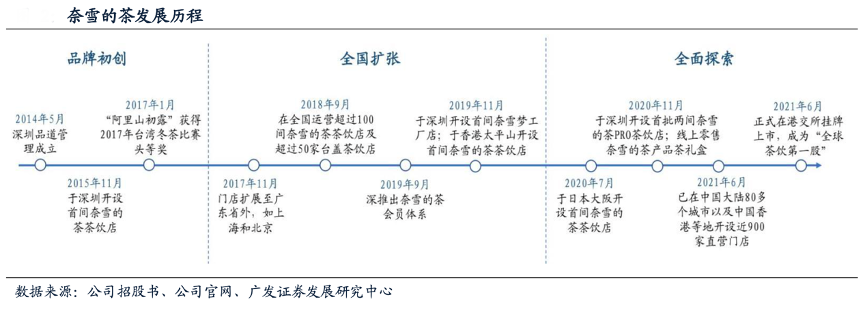 經典案例:根據公司招股書、公司官網、廣發(fā)證券發(fā)展研究中心等綜合資訊表明,奈雪的茶2015年在深圳開設首家奈雪的茶茶飲店,開創(chuàng)了“茶飲+ 軟歐包”雙品類模式;2020年11月,公司推出奈雪的茶PRO店以提升門店運營效率,通過布局線上零售業(yè)務助力業(yè)績提升;2021年6月,奈雪的茶正式在港交所上市,成為“全球茶飲第一股”。
