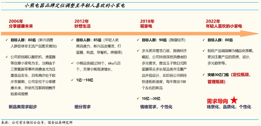 經(jīng)典案例:根據(jù)公司官方微信公眾號、國金證券研究所等綜合資訊表明,困境之下小熊公司積極求變,22 年升級新定位致力成為年輕人喜歡的小家電品牌,相應產(chǎn)品端調(diào)整為精品化策略,更加注重產(chǎn)品的質(zhì)感、設計、多元趨勢等。