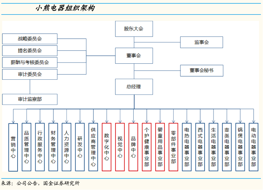 經(jīng)典案例:根據(jù)公司公告、國金證券研究所等綜合資訊表明,2021年12月小熊熊公司對組織架構(gòu)進行調(diào)整,本輪調(diào)整主要新增“數(shù)字化中心”、“視覺中心”、“品牌中心”,數(shù)字化中心突顯公司對 數(shù)字化能力構(gòu)建的重視,視覺中心有助于更好助推產(chǎn)品精品化策略。