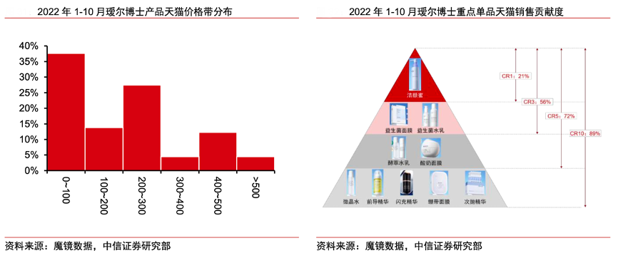 經(jīng)典案例:根據(jù)魔鏡數(shù)據(jù)、中信證券研究部等綜合資訊表明,璦爾博士落實(shí)品類擊穿策略,重點(diǎn)單品貢獻(xiàn)度高。從重點(diǎn)單品銷售貢獻(xiàn)度來(lái)看,璦爾博士單品 貢獻(xiàn)較高,前三大單品銷售貢獻(xiàn)度達(dá) 56%,前五大單品銷售貢獻(xiàn)度達(dá) 72%。據(jù)魔鏡數(shù)據(jù),2022年 1-10 月璦爾博士銷售額最高的 Top 3 產(chǎn)品分別為潔顏蜜、益生菌面膜和益生菌水乳,均為品牌定位較低單品系列。