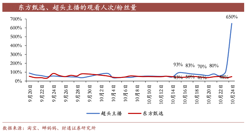 經(jīng)典案例:根據(jù)淘寶、蟬媽媽、財(cái)通證券研究所等綜合資訊表明,對(duì)比超頭主播直播間與東方甄選的觀看人次相對(duì)粉絲量的比例,東方甄選當(dāng)前已接近超頭主播的日常相對(duì)場(chǎng)觀/粉絲比。而超頭主播已形成對(duì)粉絲群體的個(gè)人/品牌影響力,在購物節(jié)等大促活動(dòng)期間能夠達(dá)到上億的觀看量,10 月 24 日雙十一預(yù)售期間,超頭主播直播間觀看量達(dá)到 4.6 億,觀看量/粉絲比例達(dá)到 650%。