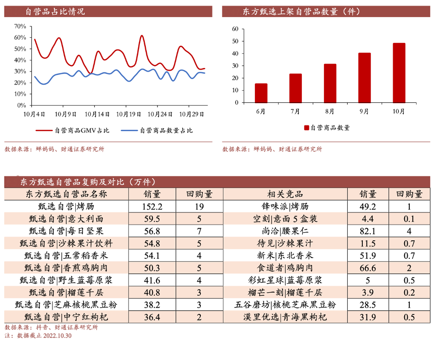 經(jīng)典案例:根據(jù)蟬媽媽、抖音、財(cái)通證券研究所等綜合資訊表明,結(jié)合蟬媽媽數(shù)據(jù)大致估算,10月東方甄選自營品數(shù)量占比約為20%-30%,GMV (預(yù)計(jì))占比約為 30%-40%。其每月新增 5-10 款自營商品,甄選自營系列商品主要為農(nóng)產(chǎn)品類,對(duì)比同類競品,甄選自營系列產(chǎn)品具備更高的銷量與回購率,具有更高的消費(fèi)者認(rèn)可度。
