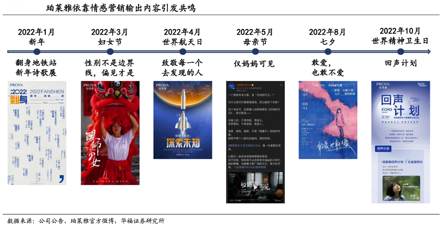 經(jīng)典案例:根據(jù)公司公告、珀萊雅官方微博、華福證券研究所等綜合資訊表明,2021年起,珀萊雅在簽約代言人營銷之外加碼情感營銷,持續(xù)不斷地輸出優(yōu)質(zhì)內(nèi)容,用鮮明的態(tài)度鼓勵(lì)年輕群體勇敢探索世界。2021 年 3 月在國際婦女節(jié)之際,珀萊雅聯(lián)合《中國婦女報(bào)》共同發(fā)起“性別不是邊界線,偏見才是”話題,聯(lián)動(dòng) KOL 積極發(fā)聲,微 博 TVC 播放量近 400 萬次;2022 年 3 月延續(xù)此話題,邀請醒獅全女班以及女足運(yùn)動(dòng)員推出《醒獅少女》主題片,微博視頻播放量再度接近 400 萬次,引起廣泛共鳴。