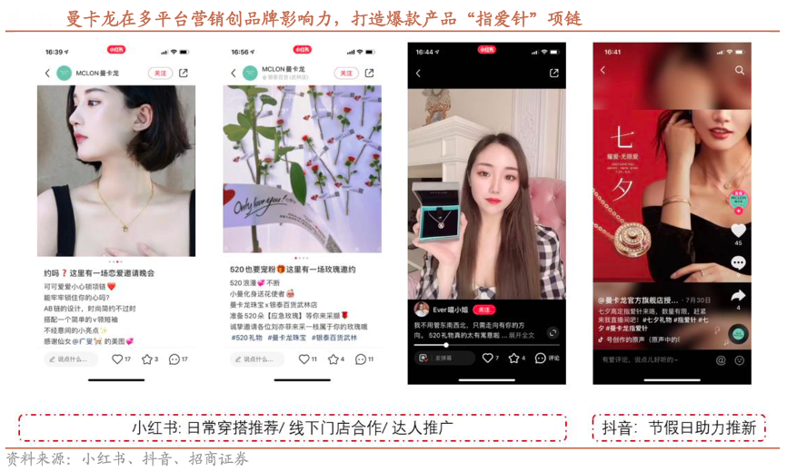 經(jīng)典案例:根據(jù)小紅書、抖音、招商證券等綜合資訊表明,曼卡龍品牌爆品“指愛針”在2021年 520,2022年 520 和七夕多次營(yíng)銷,放量大幅拉動(dòng)鑲嵌產(chǎn)品的銷售,其在小紅書、抖音等媒介通過(guò)日常穿搭推薦、與線下商場(chǎng)門店以及達(dá)人合作等方式深化品牌定位,精準(zhǔn)客戶畫像。“指愛針”的營(yíng)銷內(nèi)容在抖音達(dá)到 7.9 億播放量,互動(dòng)3000+萬(wàn),520、七夕期間,爆款項(xiàng)鏈在天貓、京東的單品銷量榜均為第一。