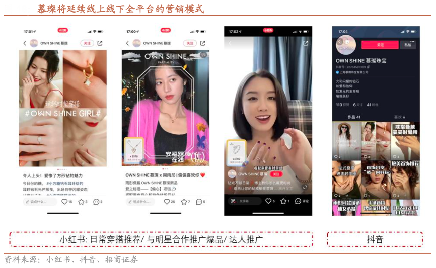 經(jīng)典案例:根據(jù)小紅書、抖音、招商證券等綜合資訊表明,對(duì)應(yīng)慕璨品牌借助曼卡龍策略,在營(yíng)銷模式上其借鑒主品牌經(jīng)營(yíng)經(jīng)驗(yàn),目前也在多個(gè)線上平臺(tái)進(jìn)行內(nèi)容營(yíng)銷,以提升品牌的影響力以及消費(fèi)者對(duì)品牌的認(rèn)知程度,其中,注重內(nèi)容傳播優(yōu)勢(shì)的小紅書是目前品牌營(yíng)銷的主戰(zhàn)場(chǎng)。作為時(shí)髦傳達(dá)的品牌,小紅書和抖音平臺(tái)上慕璨推出多種搭配方式,多產(chǎn)品與服裝的搭配融為一體,進(jìn)一步深化消費(fèi)者對(duì)培育鉆石的品牌接受度。