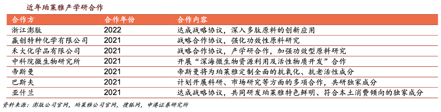 經(jīng)典案例:根據(jù)澎肽公司官網(wǎng)、珀萊雅公司官網(wǎng)、搜狐網(wǎng)、申港證券研究所等綜合資訊表明,2022年珀萊雅與浙江澎肽展開戰(zhàn)略合作,深入多肽研發(fā)、多肽綠色合成等方面的創(chuàng)新研發(fā)。2021年其與贏創(chuàng)特種、禾大化學(xué)、中科院微生物研究所、帝斯曼、巴斯夫、亞什蘭開展合作,共同研發(fā)優(yōu)質(zhì)原料與科學(xué)配方。