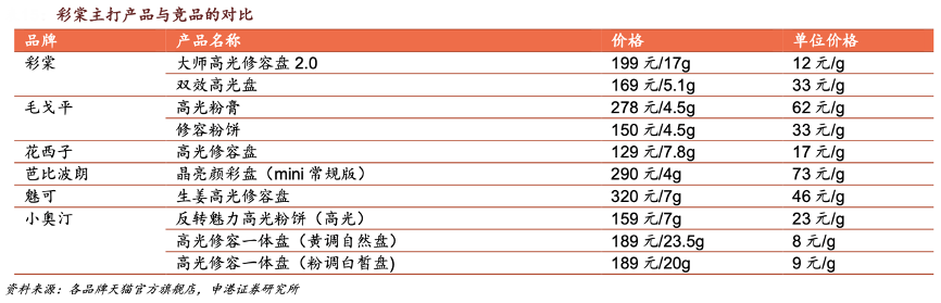 經(jīng)典案例:根據(jù)各品牌天貓官方旗艦店、申港證券研究所等綜合資訊表明,珀萊雅重點(diǎn)布局中高端底妝產(chǎn)品,高性價(jià)比搶占用戶心智。彩棠與毛戈平、花西子均從修容、高光等高階品類切入。對比2022年7月22日天貓高光榜單,從榜單前列產(chǎn)品來看,彩棠最熱單品大師高光修容盤單位價(jià)格 12 元/g,遠(yuǎn)低于毛戈平、芭比波朗、魅可等,高于小奧汀高光修容一體盤,價(jià)格定位競爭力較強(qiáng)。