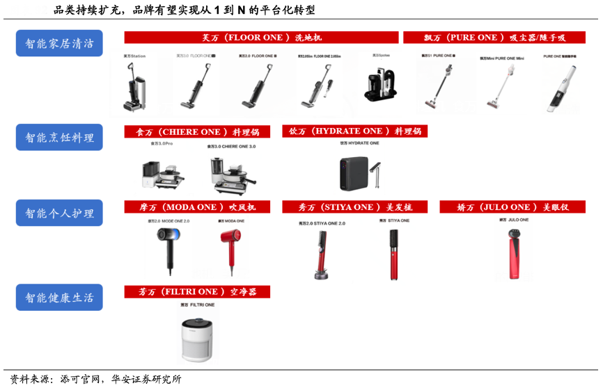經(jīng)典案例:根據(jù)添可官網(wǎng)、華安證券研究所等綜合資訊表明,添可在洗地機(jī)爆款 產(chǎn)品之外,已在 4 個(gè)細(xì)分品類方向完成初步布局,即智能家居清潔、智能烹飪料理、智能個(gè)人護(hù)理和智能健康生活,實(shí)現(xiàn)從單一智能品類向多智能品類的擴(kuò)展,并通過物聯(lián)網(wǎng)技術(shù)在多品類基礎(chǔ)上構(gòu)建用戶生態(tài)。