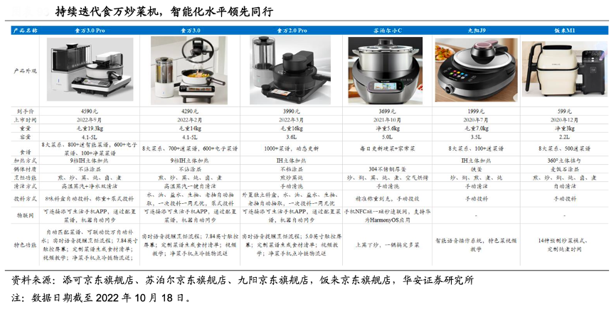 經(jīng)典案例:根據(jù)添可京東旗艦店、蘇泊爾京東旗艦店、九陽京東旗艦店、飯來京東旗艦店、華安證券研究所等綜合資訊表明,對比市場同類競品,添可的食萬 3.0 以互聯(lián)網(wǎng)和物聯(lián) 網(wǎng)(可通過“添可生活 APP”定制菜譜并可在“食萬凈菜”下單送貨上門)技術(shù)為支撐,通過數(shù)字化(精準(zhǔn)控溫、自動(dòng)稱量)、智能化(語音提醒、視頻教學(xué))和自動(dòng)化(自動(dòng)投 料、自動(dòng)翻炒、自清潔)手段,將洗菜、切菜、備菜、烹飪、清潔全流程打通,逐步解決用戶痛點(diǎn),同時(shí)也逐步搭建起集食譜研發(fā)、食材篩選、烹飪研究及食萬凈菜生產(chǎn)于一體的生態(tài)體系,兼具“耗材”、“服務(wù)”、“私域運(yùn)營”等多重屬性,增強(qiáng)和延展產(chǎn)品的壽命周期。