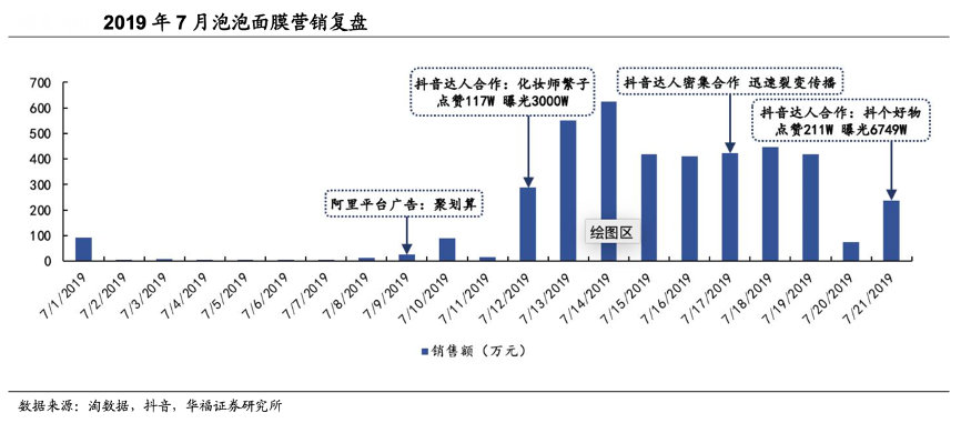 經(jīng)典案例:根據(jù)淘數(shù)據(jù)、抖音、華福證券研究所等綜合資訊表明,珀萊雅泡泡面膜爆品的打造充分驗證公司營銷實力,2019年7月泡泡面膜的爆火充分反應了公司營銷團隊的實力,珀萊雅以抖音平臺作為首發(fā)陣地,用海量密集的投放達成種草收割,帶動 2019 年 7 月銷售額的十倍增長。