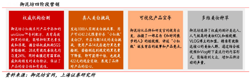 經(jīng)典案例:根據(jù)御泥坊官網(wǎng)、上海證券研究所等綜合資訊表明,御泥坊通過(guò)明星影視代言、KOL種草帶貨到與用戶一起打造單品三個(gè)階段的不斷成長(zhǎng),超膜節(jié)目前已成為御泥坊品牌的專屬節(jié)日。在最近 422 超膜節(jié)上, 針對(duì)新品小紅瓶美白系列的上新,御泥坊開(kāi)展了四個(gè)階段漸進(jìn)性 的營(yíng)銷傳播活動(dòng),步步為營(yíng)地傳達(dá)產(chǎn)品的功能、體驗(yàn)?zāi)酥僚c品牌的情感聯(lián)結(jié),最終達(dá)成 422 超膜節(jié)用戶心智的占領(lǐng)。