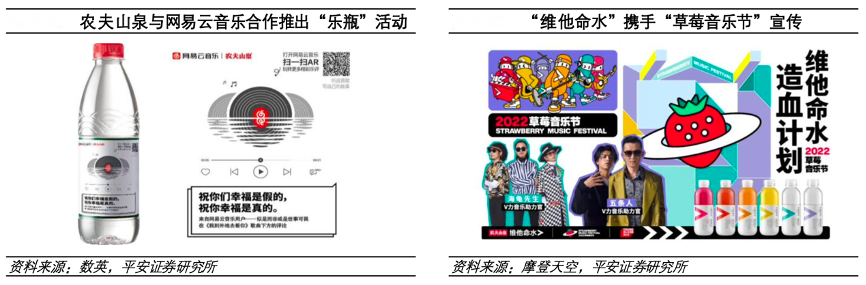 經(jīng)典案例:根據(jù)數(shù)英、摩登天空、平安證券研究所等綜合資訊表明,農(nóng)夫山泉2017 年與網(wǎng)易云音樂(lè)合作推出“樂(lè)瓶”聯(lián)名活動(dòng),精選了 52 條音樂(lè)評(píng)論并印制在樂(lè)瓶瓶身,在本活動(dòng)中推出約4億瓶“有故事的水”引發(fā)消費(fèi)者強(qiáng)烈的情感共鳴。同時(shí),2021-2022年,公司旗下“維他命水”攜手“草莓音樂(lè)節(jié)”、“草莓 MDSK 音樂(lè)節(jié)”宣傳,進(jìn)一步提高了品牌在年輕消費(fèi)者中的知名度。