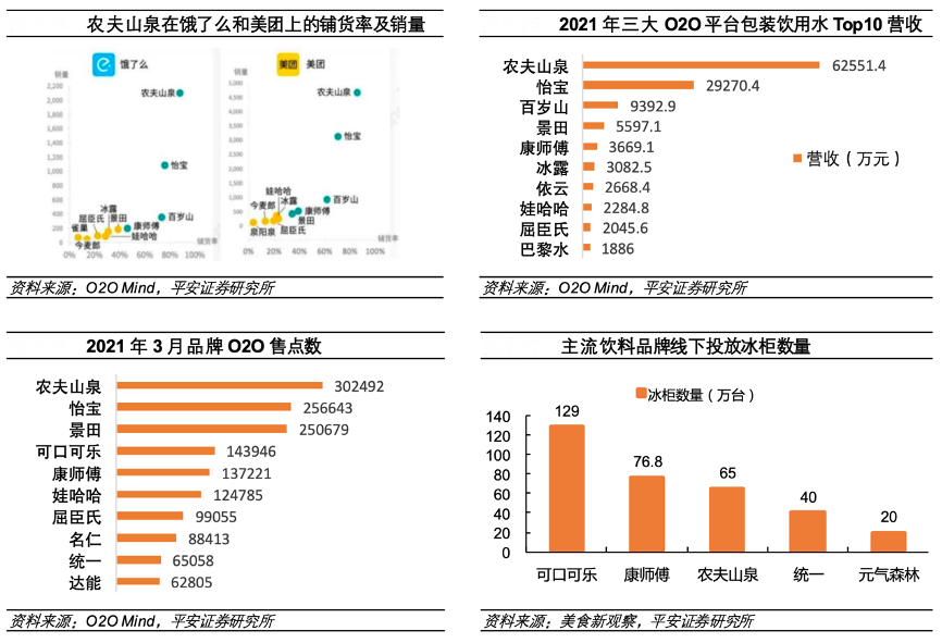 公司在 O2O 平臺(tái)上終端網(wǎng)點(diǎn)數(shù)居行業(yè)首位,據(jù) O2O Mind 大數(shù)據(jù)統(tǒng)計(jì),2021 年農(nóng)夫山泉在餓了么及美團(tuán)平臺(tái)上的鋪貨率已超過(guò) 80%,在前三大 O2O 平臺(tái)(美團(tuán)、餓了么和京東到家)上營(yíng)收達(dá) 6.26 億元,遠(yuǎn)高于行業(yè)其他品牌。