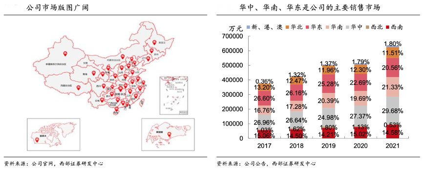 經(jīng)典案例:根據(jù)公司官網(wǎng)、公司公告、西部證券研發(fā)中心等綜合資訊表明,絕味食品得益于加盟模式的驅動,公司門店數(shù)量快速增長,成功構建了覆蓋全國的銷售網(wǎng)絡。近年來公司的區(qū)域布局較為穩(wěn)定,華中、華南、華東地區(qū)是公司的主要銷售市場,營業(yè)收入穩(wěn)步上升, 2021 年合計為公司貢獻超七成營業(yè)收入。