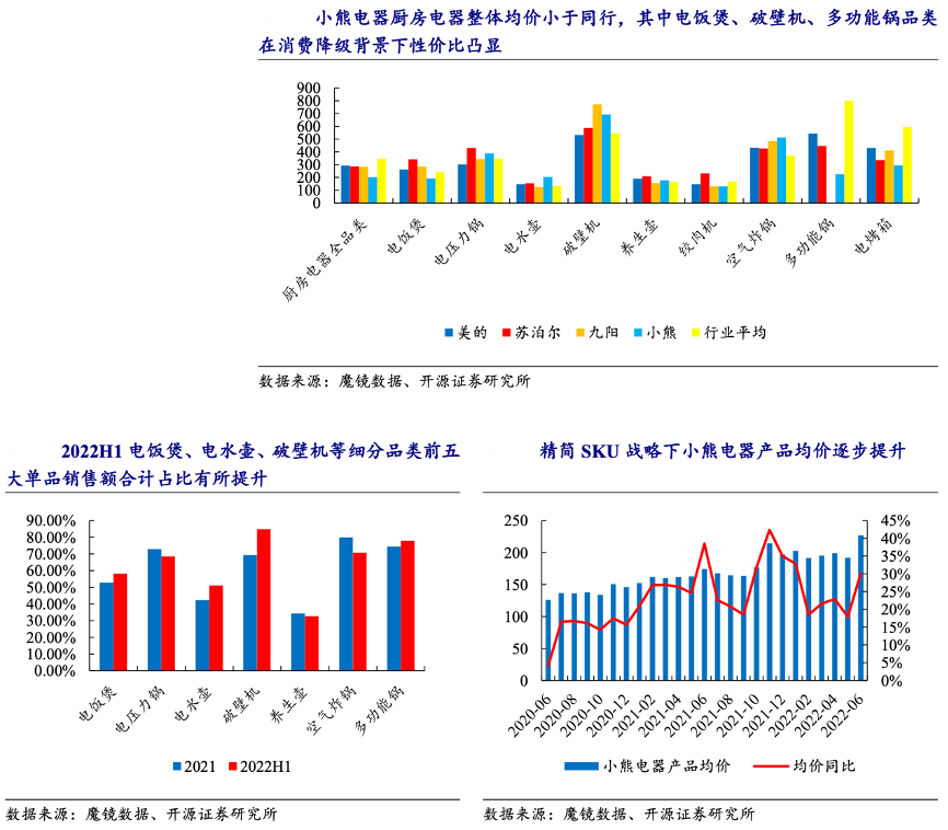 經(jīng)典案例:根據(jù)魔鏡數(shù)據(jù)、開(kāi)源證券研究所等綜合資訊表明,早期小熊電器通過(guò)多 SKU 特征覆蓋更多人群,但帶來(lái) 較多高流量?jī)r(jià)值低銷(xiāo)售價(jià)值的產(chǎn)品,當(dāng)前小熊電器更多聚焦產(chǎn)品品質(zhì),推行精簡(jiǎn) SKU 戰(zhàn)略。魔鏡數(shù)據(jù)顯示小熊電器 2022H1 電飯煲、電水壺、破壁機(jī)、多功能鍋細(xì)分品類(lèi)前五大單品銷(xiāo)售額合計(jì)占比較 2021 年有所提升。