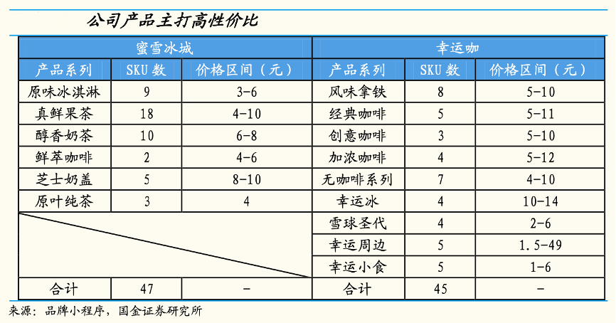 經(jīng)典案例:根據(jù)品牌小程序、國金證券研究所等綜合資訊表明,蜜雪冰城低價高質(zhì)產(chǎn)品受眾廣泛,經(jīng)典單品+定期推新保持菜單吸引力。從蜜雪冰城、幸運咖菜單看,產(chǎn)品系列主要有冰淇淋、果茶、奶茶、咖啡四大類,SKU數(shù)在 45 個左右,價格區(qū)間上蜜雪基本在 10 元以下,經(jīng)典冰淇淋僅 3 元,產(chǎn)品性價比高、可選范圍較廣。