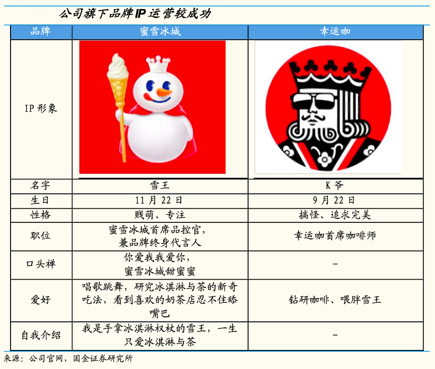 經(jīng)典案例:根據(jù)公司官網(wǎng)、國金證券研究所等綜合資訊表明,蜜雪冰城人格化 IP“雪王”營銷成功,2021年洗腦廣告曲傳播進一步推升品牌知名度。從經(jīng)驗看,人格化 IP 的成功塑造有助于形成品牌與消費者間的情感鏈接、提升品牌黏性。