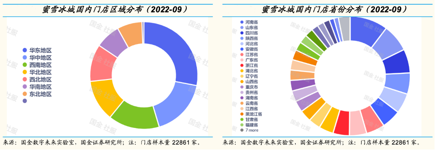 經(jīng)典案例:根據(jù)國金數(shù)字未來實(shí)驗(yàn)室、國金證券研究所等綜合資訊表明,蜜雪冰城已基本完成區(qū)域品牌向全國品牌轉(zhuǎn)化過程,目前2萬余家門店覆蓋全國各省,從分布看,華東最高為28.5%,華中、西南、西北占比均超10%,華南、華北各約7.4%,除大本營河南省外,山東省、四川省、山西省、河北省等 6 省門店數(shù)占比超 5%,有優(yōu)勢區(qū)域的同時(shí)全國布局已相對均勻。
