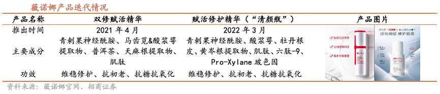 經(jīng)典案例:根據(jù)薇諾娜官網(wǎng)、招商證券等綜合資訊表明,截至目前,薇諾娜產(chǎn)品矩陣已由基礎(chǔ)的皮膚修護(hù)、舒敏、補(bǔ)水保濕延伸至美 白、抗老、防曬等功能;2022 年 3 月,其在抗初老系列中對(duì)雙修賦活精華進(jìn)行升級(jí),推出賦活修護(hù)精華“清顏瓶”,在配方及包裝等方面均進(jìn)行了迭代升級(jí)。2022 年 9 月,薇諾娜推出新品“特護(hù)精華”,添加全新專利成分青刺果 PRO,精準(zhǔn)直擊肌膚敏感根源靶點(diǎn),從而實(shí)現(xiàn)深度修護(hù),新品特護(hù)精華成為品牌雙十一最大的新增亮點(diǎn),收入規(guī)模近 3 個(gè)億,收入貢獻(xiàn)達(dá)到16.5%。
