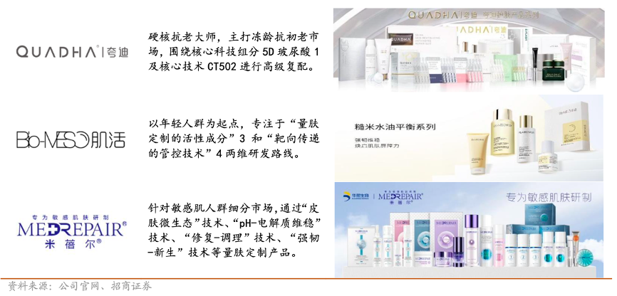經(jīng)典案例:根據(jù)公司官網(wǎng)、招商證券等綜合資訊表明,華熙生物公司四大核心品牌均已度過起步期,差異化定位日漸清晰。潤百顏定位“透明質(zhì)酸護(hù)膚核心品牌”,深挖玻尿酸 功效,借助“玻尿酸+活性物”打開品牌的廣闊成長空間;夸迪定位“抗衰、抗初老”,主打凍齡抗初老市場,圍繞核心科技組分 5D 玻尿酸 1 及核心技術(shù) CT502 進(jìn)行高級復(fù)配。