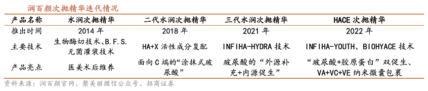 經(jīng)典案例:根據(jù)潤百顏官網(wǎng)、聚美麗微信公眾號、招商證券等綜合資訊表明,2021年,其推出潤百顏第三代次拋精華,運(yùn)用 INFIHA-HYDRA 技術(shù)實(shí)現(xiàn)玻尿酸的外源補(bǔ)充+內(nèi)源促生,該產(chǎn)品也成為潤百顏?zhàn)罹叽硇缘拇髥纹分弧?022 年,公司憑借 INFIHA-YOUTH 及 BIOHYACE 技術(shù),推出主打“玻尿 酸+膠原蛋白”雙促生和VA+VC+VE 納米微囊包裹的潤百顏 HACE 次拋精華,進(jìn)一步強(qiáng)化品牌核心的“次拋”特色。