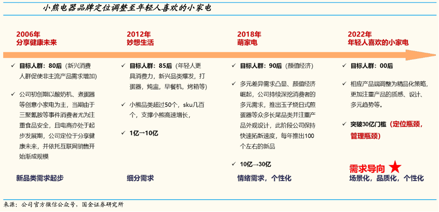 經(jīng)典案例:根據(jù)公司官方微信公眾號、國金證券研究所等綜合資訊表明,小熊電器積極順應(yīng)市場變化,四次品牌定位躍升。面對多變的市場環(huán)境,其積極求變,順應(yīng)市場趨勢,具備快速捕捉市場且自適調(diào)整的能力,契合第三消費(fèi)時代對企業(yè)的要求。