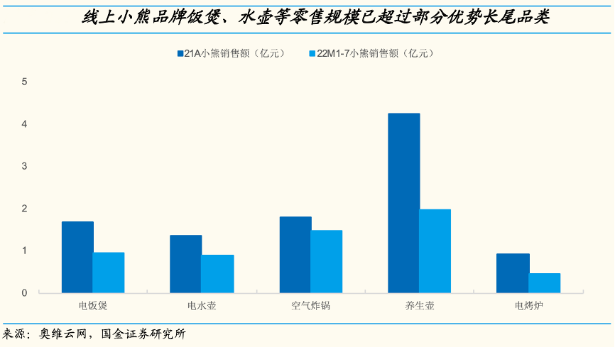 經(jīng)典案例:根據(jù)奧維云網(wǎng)、國金證券研究所等綜合資訊表明,2021年線上小熊電飯煲和電水壺銷售額分別 1.66 億元和 1.34 億元,已超過電烤爐(0.93 億元)等優(yōu)勢的長尾品類。