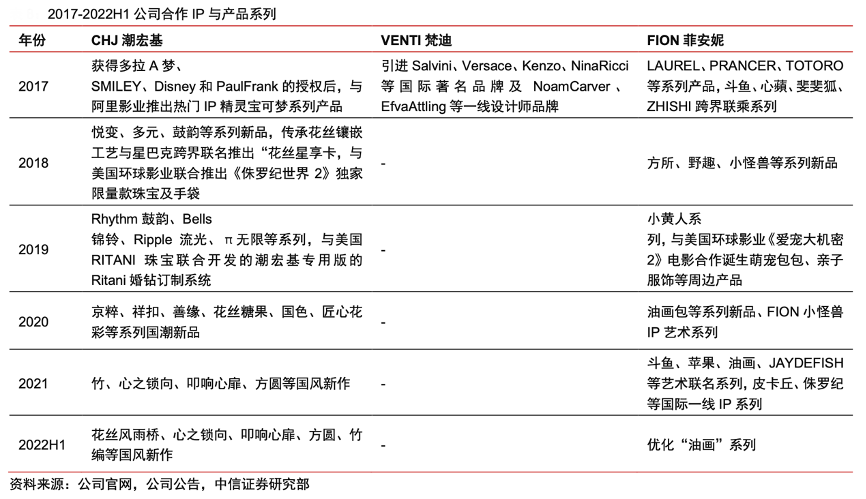 經(jīng)典案例:根據(jù)公司官網(wǎng)、公司公告和中信證券研究部等綜合資訊表明,自 2017 年至今,潮宏基公司不斷與國際一線 IP、廠商展開合作,CHJ 潮宏基與 FION 菲安妮推出了一系列知名 IP 系列產(chǎn) 品,如“哆啦 A 夢”、“寶可夢”、“小黃人”、《侏羅紀(jì)世界 2》獨家限量款珠寶、《愛寵大機 密 2》周邊產(chǎn)品等。其堅持國風(fēng)之美,將傳統(tǒng)文化、非遺工藝(花絲工藝)與現(xiàn)代時尚的完美結(jié)合,提升了產(chǎn)品內(nèi)涵層次,打造出潮宏基珠寶獨特的產(chǎn)品差異性。