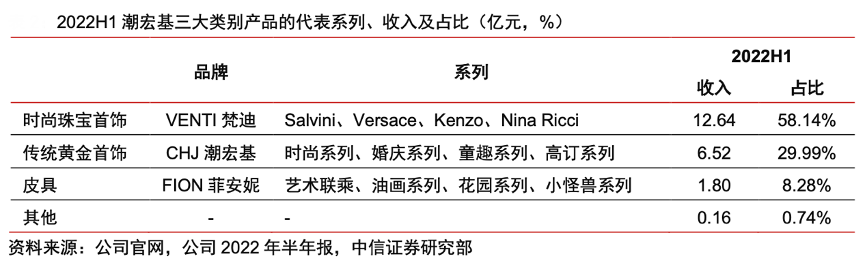經(jīng)典案例:根據(jù)公司官網(wǎng)、公司2022年半年報和中信證券研究部等綜合資訊表明,目前,潮宏基主要產(chǎn)品包括時尚珠寶首飾、傳統(tǒng)黃金首飾和皮具,形成了 CHJ 潮宏基、VENTI 梵迪、FION 菲安妮三大品牌的時尚生 態(tài)圈。截至 2022H1,公司營業(yè)收入 21.74 億元,其中,時尚珠寶首飾收入 12.64 億元, 占比 58.14%。