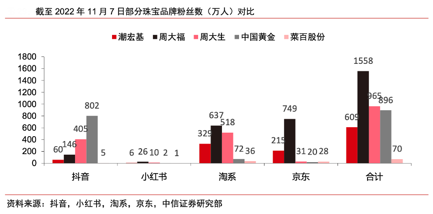 經(jīng)典案例:根據(jù)抖音、小紅書、淘系、京東、中信證券研究部等綜合資訊表明,CHJ 潮宏基以唐藝昕為代言人,F(xiàn)ION 菲安妮簽約青年演員喬欣作為品牌代言人,繼續(xù)強(qiáng)化公司年輕化品牌形象。通過高熱度的年輕化 IP 產(chǎn)品和逐年增長的廣告宣傳費(fèi)用,2021 年末公司已有約 1400 萬會員。截至 2022 年 11 月 7 日,公司在抖音、小紅書、淘系、京東平臺上吸引并聚集了約 609 萬 粉絲。