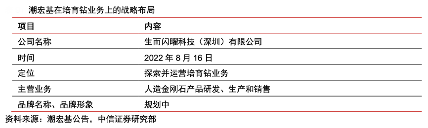 經(jīng)典案例:根據(jù)潮宏基公告、中信證券研究部等綜合資訊表明,潮宏基公司與培育鉆生產(chǎn)商合作運(yùn)營培育鉆業(yè)務(wù),產(chǎn)業(yè)鏈協(xié)同效應(yīng)提高市場競爭力。2022 年 8 月 16 日,其與河南省力量鉆石股份有限公司等合作方簽訂了《公司設(shè)立協(xié)議書》,出資 1100 萬元(占股55%)與合作方共同投資設(shè)立生而閃曜科技(深圳)有限公司(以下簡稱“生而閃曜”),創(chuàng)建并運(yùn)營培育鉆石珠寶首飾品牌,共同探究、經(jīng)營培育鉆業(yè)務(wù)。生而閃曜主營業(yè)務(wù)為人造金剛石產(chǎn)品研發(fā)、生產(chǎn)和銷售。