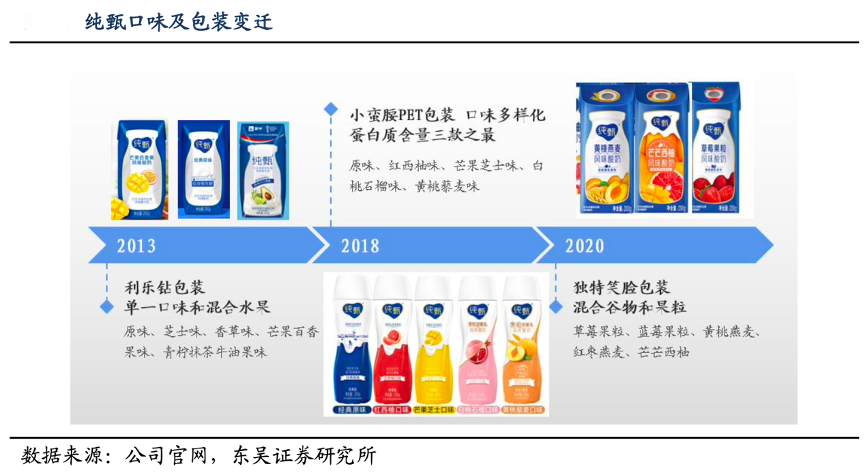 經(jīng)典案例:根據(jù)公司官網(wǎng)、東吳證券研究所等綜合資訊表明,常溫酸奶的升級(jí)發(fā)展伴隨口味及包裝的創(chuàng)新與變遷。常溫酸奶的口味從單一向混合谷物、水果發(fā)展,包裝從利樂(lè)鉆向利樂(lè)冠、PET 瓶變遷,擴(kuò)展了多種 SKU,產(chǎn)品持續(xù)升 級(jí)和創(chuàng)新,強(qiáng)化休閑屬性,便利性和個(gè)性化突出。