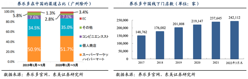 經(jīng)典案例:根據(jù)養(yǎng)樂(lè)多官網(wǎng)、東吳證券研究所等綜合資訊表明,以養(yǎng)樂(lè)多為例,2020 年 1-9 月養(yǎng)樂(lè)多在中國(guó)的超市、個(gè)人商店、便利店的渠道占比超 90%;截至 2022 年 3 月末,線下網(wǎng)點(diǎn)布局超 24 萬(wàn)家門店。線下渠道為低溫乳品的銷售基礎(chǔ),同時(shí)線上渠道成為品牌營(yíng)銷的重要陣地。