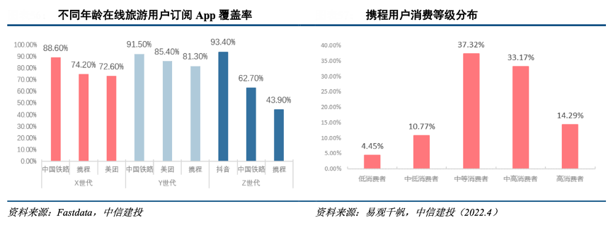 經(jīng)典案例:根據(jù)Fastdata、易觀千帆、中信建投等綜合資訊表明,攜程發(fā)布的《中國高端旅游出行趨勢洞察》,31-50 歲用戶是旅行消費的主力軍,攜程用戶中 31-50 歲用戶的占比接近70%;與此同時,攜程在年輕一代的安裝率也呈逐年上升趨勢,根據(jù)易觀千帆,2022 年 4 月攜程用戶中中等以上消費者占比達到85 %。