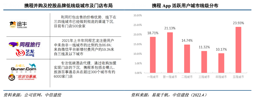 經(jīng)典案例:根據(jù)公司官網(wǎng)、易觀千帆、中信建投等綜合資訊表明,美團酒旅的快速崛起某種程度上得益于其在下沉市場的布局,近年來,為應(yīng)對美團等新興巨頭的競爭,攜程也積極深入下沉市場,其主要打法分為兩個方向,一是通過去哪兒等合作平臺拓展低線城市低星酒店市場,另一方面是聯(lián)手去哪兒、百事通等平臺以加盟模式大力布局低線城市線下門店,提高下沉市場滲透率。