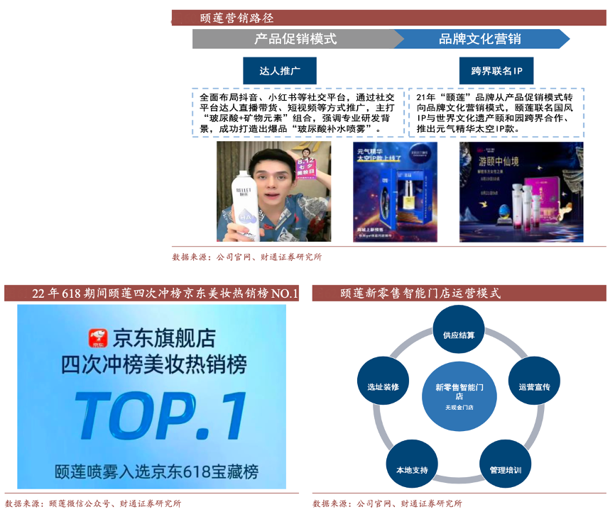 經(jīng)典案例:根據(jù)頤蓮微信公眾號(hào)、公司官網(wǎng)和財(cái)通證券研究所等綜合資訊表明,頤蓮品牌打通全渠道鏈路,線上聯(lián)合超頭多點(diǎn)種草。具體來(lái)看:1)線上,頤蓮目前仍以線上銷售為主,21 年線上收入占比達(dá) 96.17%。除傳統(tǒng)電商渠道之外,重點(diǎn)布局 抖音、快手、小紅書等平臺(tái),持續(xù)推廣其大單品頤蓮噴霧,實(shí)現(xiàn)品牌的引流與留 存效果;2)線下重視新興業(yè)態(tài)渠道:21 年頤蓮線下收入占比 3.83%,一方面聚焦年輕人群集結(jié)地,布局全國(guó)性美妝集合店及潮品店,如三福百貨、KK 及調(diào)色師、 OLE 精品超市,盒馬鮮生等新興 CS 渠道等。