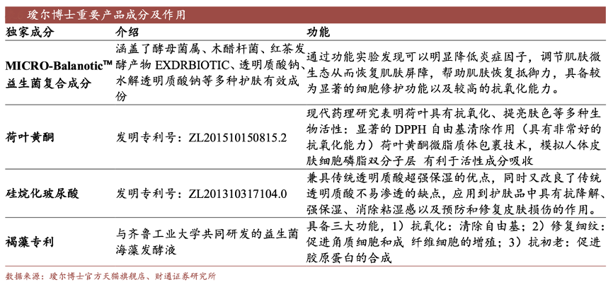 經(jīng)典案例:根據(jù)璦爾博士官方天貓旗艦店、財(cái)通證券研究所等綜合資訊表明,通過(guò)在產(chǎn)品研發(fā)領(lǐng)域的持續(xù)深耕,璦爾博士推出了多項(xiàng)獨(dú)家產(chǎn)品成分并以此持續(xù)豐富品類矩陣。品類上,目前品牌推出了身體乳、潔面慕斯、水乳品類等,以益生菌原料為主打,另外輔以氨基酸、二裂酵母、藍(lán)銅勝肽、透明質(zhì)酸、煙酰胺等原料來(lái)達(dá)到保濕、清潔和提亮效果。