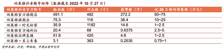 經(jīng)典案例:根據(jù)抖音、蟬媽媽、申港證券研究所等綜合資訊表明,珀萊雅圍繞主賬號構(gòu)建賬號矩陣,搶占流量池。珀萊雅抖音有 6 個官方賬號,以珀萊雅 官方旗艦店為核心賬號,輻射珀萊雅旗艦店、珀萊雅·時光秘密等 5 個二級賬號。珀萊雅官方旗艦店目前擁有粉絲 491.1 萬,發(fā)布作品 462 個,獲贊 272.2 萬,近 30 日場均銷售額達到 50~75 萬元。