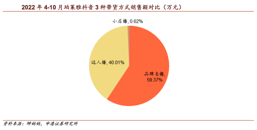 經(jīng)典案例:根據(jù)蟬媽媽、申港證券研究所等綜合資訊表明,珀萊雅注重自播渠道,直達消費者沉淀私域流量。2022 年 4-10 月,珀萊雅品牌自播、 達人播、小店播帶貨銷售額分別為 2.5~5 億、1 億~2.5 億、250~500 萬元,占比 分別為 59.37%、40.01%、0.62%。