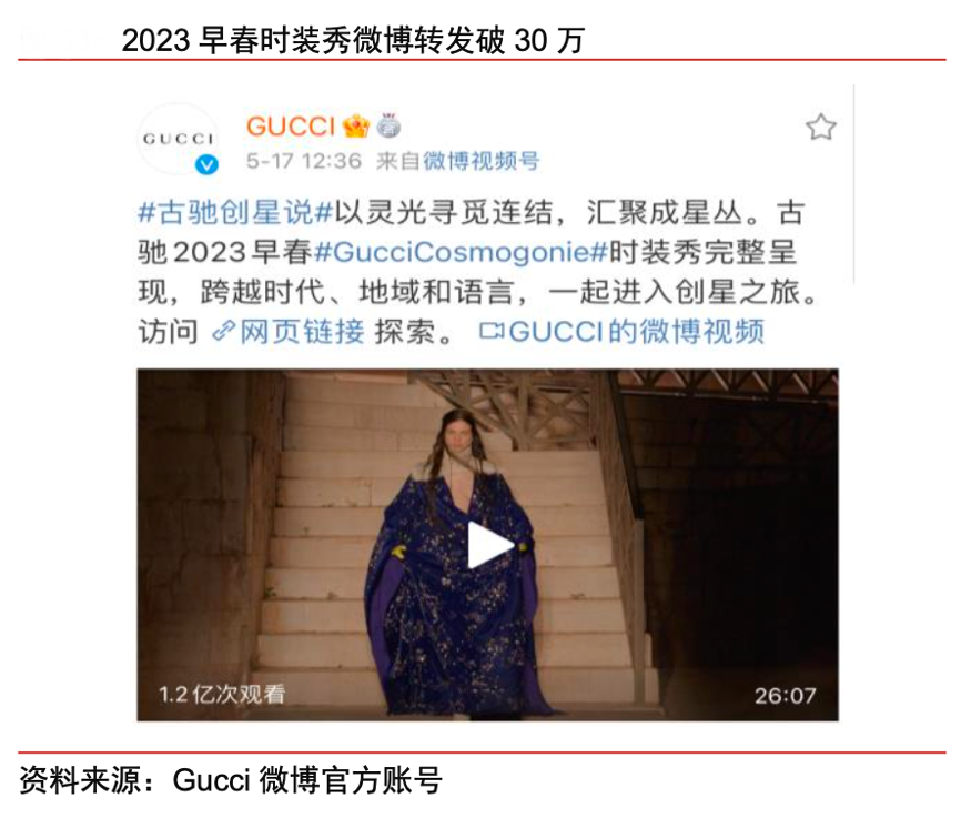 經(jīng)典案例:根據(jù)Gucci微博官方帳號(hào)、中信證券研究部等綜合資訊表明,Gucci除產(chǎn)品設(shè)計(jì)年輕化外,Gucci 亦通過(guò)社交媒體等數(shù)字化渠道搶占千禧一代心智,國(guó)內(nèi)外分別以千禧一代最為集中的 Instgram 和微博為主要陣地進(jìn)行投放,通過(guò)官方、KOL 種草助力品牌破圈;在中國(guó)市場(chǎng),品牌所有營(yíng)銷(xiāo)大事件都配合微博進(jìn)行話(huà)題流量投放,獲取了較高的討論熱度,2023 早春時(shí)裝秀獲多位一線明 星轉(zhuǎn)發(fā),累計(jì)播放量超 1.2 億次,轉(zhuǎn)發(fā)量超 30 萬(wàn)。