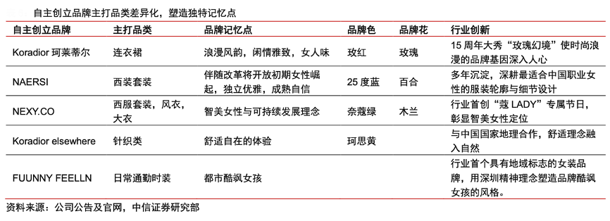 經(jīng)典案例:根據(jù)公司公告及官網(wǎng)、中信證券研究部等綜合資訊表明,贏家時(shí)尚公司從核心品類(lèi)出發(fā)劃分各品牌定位,打造獨(dú)特記憶點(diǎn)。以公司自主創(chuàng)立品牌為例,珂萊蒂爾核心定位為閑情雅致,女人味,因此主打品類(lèi)為最能體現(xiàn)浪漫情調(diào)的連衣裙;娜爾思的創(chuàng)立伴隨改革開(kāi)放初期女性崛起,旨在給女性提供獨(dú)立優(yōu)雅、成熟自信的盛年服裝,因此主打品類(lèi)為西服套裝。