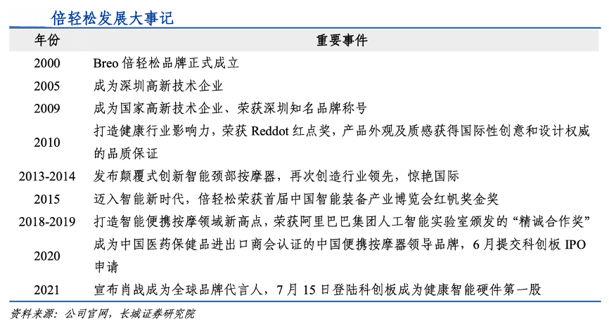 經(jīng)典案例:根據(jù)公司官網(wǎng)、長(zhǎng)城證券研究院等綜合資訊表明,倍輕松公司自成立以來便專注于小型便攜智能按摩器具的設(shè)計(jì)、研發(fā)、生產(chǎn)、銷售及服務(wù),經(jīng)過二十余載的耕耘,公司先后獲得境內(nèi)外重要獎(jiǎng)項(xiàng)十余項(xiàng),成為中國(guó)智能按摩器具行業(yè)領(lǐng)軍企業(yè)。2021 年 7 月 15 日,公司成功 IPO,成為我國(guó)健康智能硬件第一股。