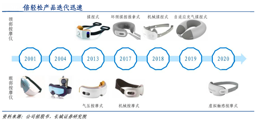 經(jīng)典案例:根據(jù)公司招股書、長(zhǎng)城證券研究院等綜合資訊表明,倍輕松公司眼部按摩儀自2001年至今經(jīng)歷過五次迭代,產(chǎn)品技術(shù)由傳統(tǒng)氣壓式發(fā)展至虛擬觸感式,目前能最大限度地還原真人手指揉按的手法及觸感,并且還嵌入物聯(lián)網(wǎng)模組,使其能夠?qū)崿F(xiàn)智能傳感和控制功能。頸部按摩儀產(chǎn)品迭代同樣迅速,短短十年時(shí)間也迭代四次。