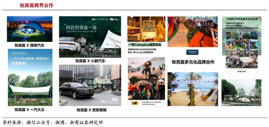 經(jīng)典案例:根據(jù)微信公眾號、微博、浙商證券研究所等綜合資訊表明,牧高笛近年開展的跨界合作主要包括:1)贊助專業(yè)隊伍:贊助北大山鷹社徒步中國南極科考、徒步加拿大洛基山脈等,強化“露營專業(yè)主義”品牌形象;2)汽車品牌合作:與理想、小鵬、勞斯萊斯、奔馳等高端車企合作舉辦露營活動,直接觸達精致露營目標(biāo)客群,同時加深高端、精致的品牌形象;3)綜藝節(jié)目合作:2022 年 4 月公司與愛奇藝、江蘇衛(wèi)視聯(lián)合出品戶外綜藝《一起露營吧》,為大眾打造潮流有趣的露營白皮書,推廣精致露營概念。