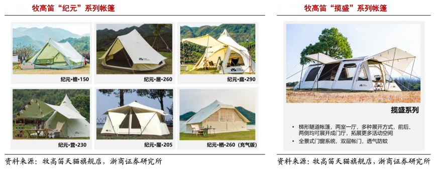 經(jīng)典案例:根據(jù)牧高笛天貓旗艦店、浙商證券研究所等綜合資訊表明,牧高笛公司于 2020 年推出“紀(jì)元”系列,定位高端精致露營市場,相比于傳統(tǒng)戶外帳篷,紀(jì)元系列帳篷內(nèi)部空間大幅擴大,高度達到 1.8-2.9 米,可以展開前廳,使用者可以在帳篷內(nèi)烹飪,契合精致露營場景的獨特需求。2021年公司推出“攬盛”梯形隧道帳篷,活動空間更大且利用率高,上市后始終占據(jù)銷量前列,多次追加補單,成為公司另一大爆款產(chǎn)品。