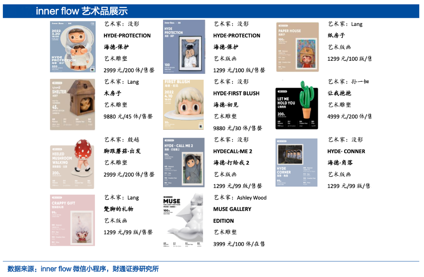 經(jīng)典案例:根據(jù)inner flow微信小程序、財通證券研究所等綜合資訊表明,為能夠更好地傳播潮流藝術(shù)文化,泡泡瑪特公司在2021年成立了藝術(shù)推廣機構(gòu) inner flow。該機構(gòu)旨在與全球書畫廊、藝術(shù)家聯(lián)合打造高端藝術(shù)衍生品,開發(fā)雕塑、潮流玩具、生活家具等收藏類藝術(shù)衍生品,為年輕人提供更豐富、更具潮流屬性的藝術(shù)品。inner flow于 2020 年在內(nèi)部開始運作,2021 年 11 月首次亮相上海 ART021,攜一眾簽約的藝術(shù)家參展