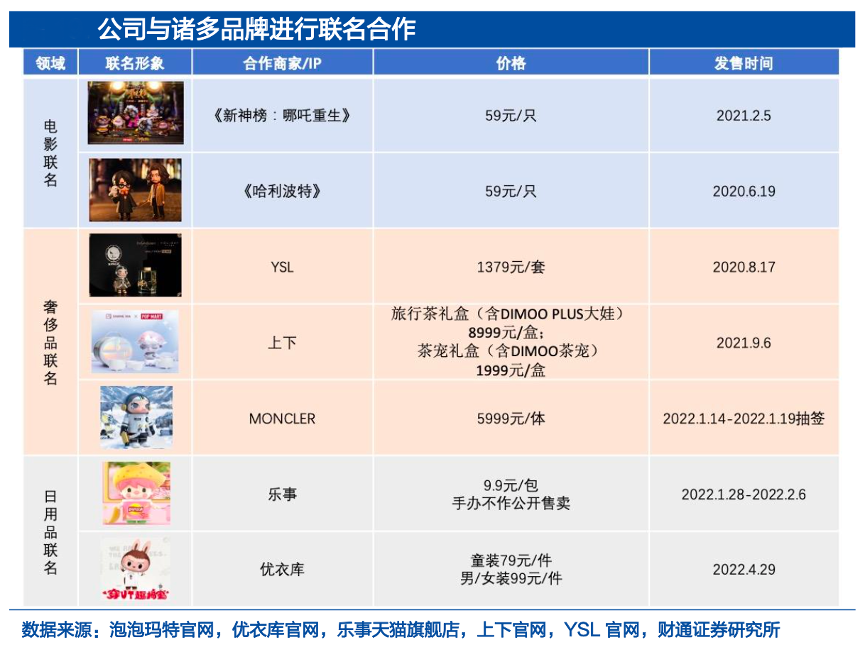 經(jīng)典案例:根據(jù)泡泡瑪特官網(wǎng)、優(yōu)衣庫官網(wǎng)、樂事天貓旗艦店、上下官網(wǎng)、YSL官網(wǎng)、財通證券研究所等綜合資訊表明,泡泡瑪特不斷通過將 IP 與實體消費品聯(lián)名結(jié)合,將自身 IP 融入大眾消 費,進一步增強 IP 的曝光與破圈。 “DIMOO”與愛馬仕集團旗下中國奢侈品“上下”品牌達成合作,推出 “SHANG XIA × DIMOO WORLD”聯(lián)名禮盒,京東、哈根達斯、絲芙蘭等亦與 DIMOO 達成品牌合作。