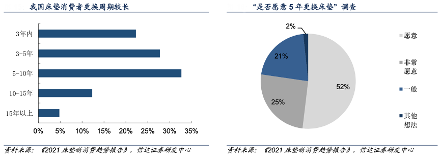 經(jīng)典案例:根據(jù)紅星美凱龍攜手優(yōu)居研究院及騰訊家居貝殼聯(lián)合發(fā)布的調(diào)研報告《2021床墊新消費趨勢報告》、信達證券研發(fā)中心等綜合資訊表明,49.8%受訪者正在使用超過 5 年的床墊,其中70、60 后正在使用10年以上的床墊的比例為 28.6%和 21%,使用床墊比例相對過低。隨著消費水平提高以及消費觀念轉(zhuǎn)變,床墊更換頻次有望提高,改善需求占比的提升有望削弱床墊消費的地產(chǎn)周期性。