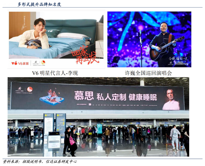 經(jīng)典案例:根據(jù)招股說(shuō)明書(shū)、信達(dá)證券研發(fā)中心等綜合資訊表明,從廣告費(fèi)用投放形式來(lái)看,2018-2021年,慕思公司的冠名贊助和公共交通場(chǎng)景廣告合計(jì)占比超過(guò) 40%,是第一廣告費(fèi)用投放方向。2019 年,以來(lái)公司加大了電商和互聯(lián)網(wǎng)廣告投入,2021年電商平臺(tái)、互聯(lián)網(wǎng)廣告占廣告支出比例分別達(dá)30%、19%。