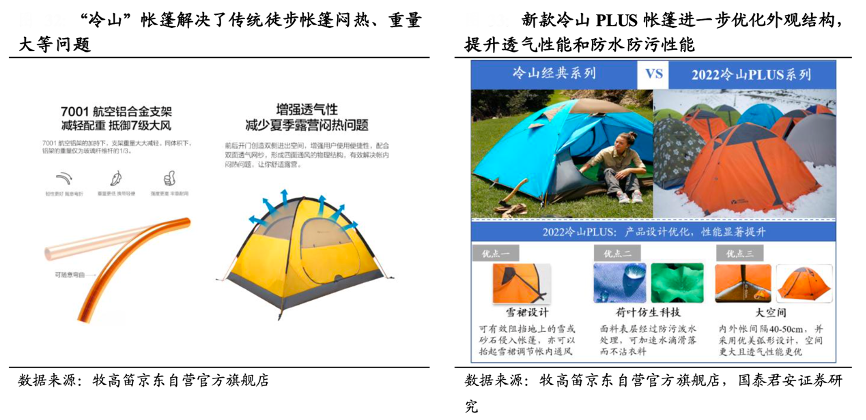 經(jīng)典案例:根據(jù)牧高笛京東自營官方旗艦店、國泰君安證券研究等綜合資訊表明,2003 年,牧高笛公司對帳篷的鋁竿支架和通風(fēng)系統(tǒng)的創(chuàng)新改進(jìn),推出了第一代具有革命性意義的“冷山”徒步帳篷,克服了傳統(tǒng)徒步帳篷悶熱、重量大等痛點(diǎn),并成為中國徒步露營的標(biāo)桿產(chǎn)品。目前已推出第五代“冷山”,針對防雨、透氣性能以及產(chǎn)品外觀和配色等方面持續(xù)優(yōu)化,已成為 70 萬用戶的品質(zhì)之選。